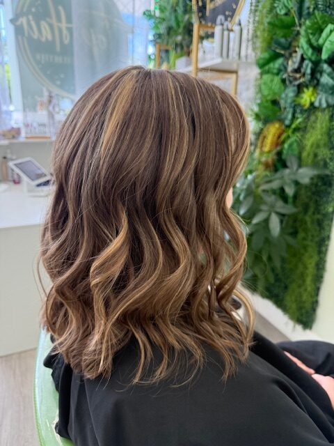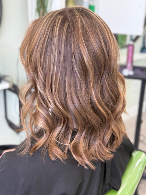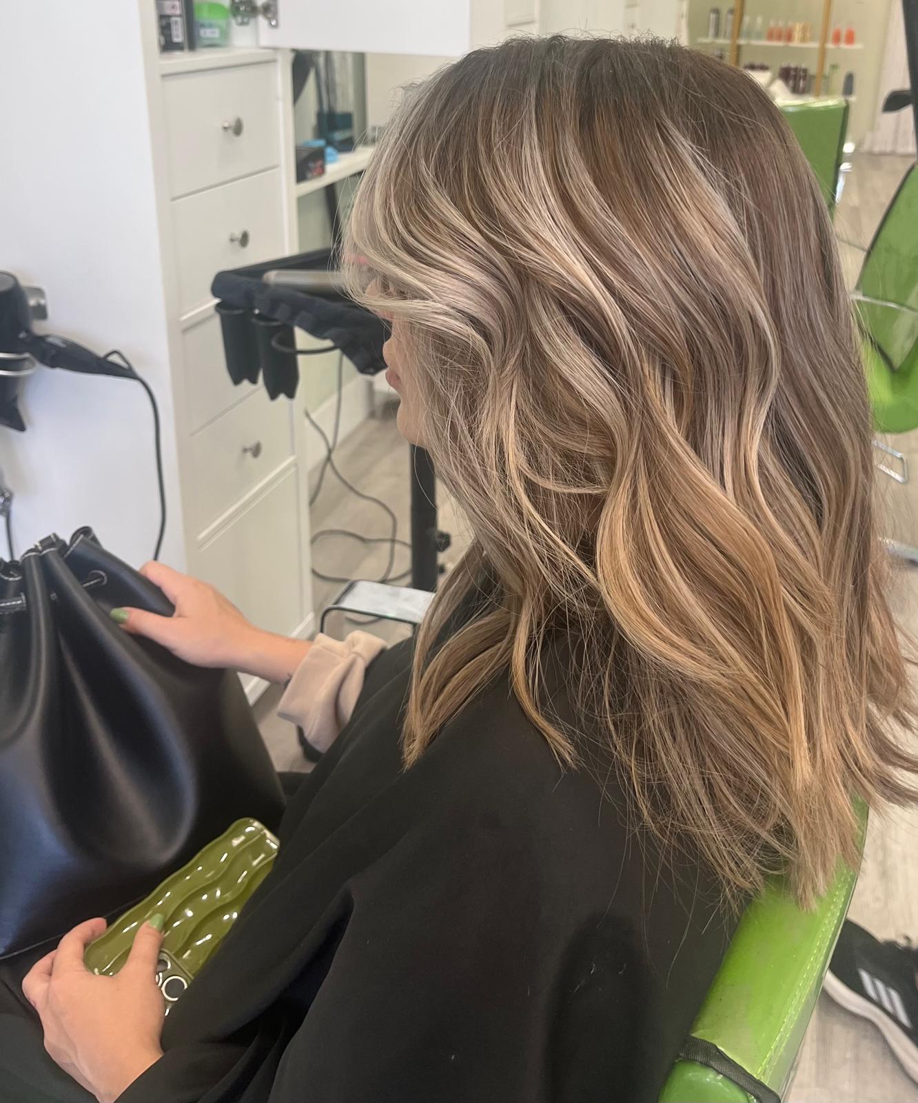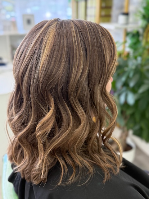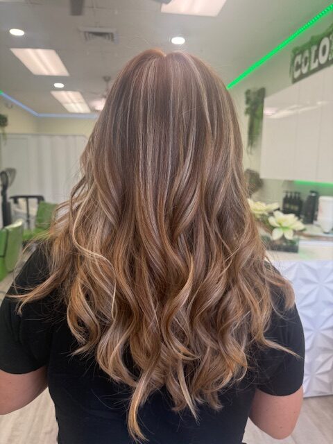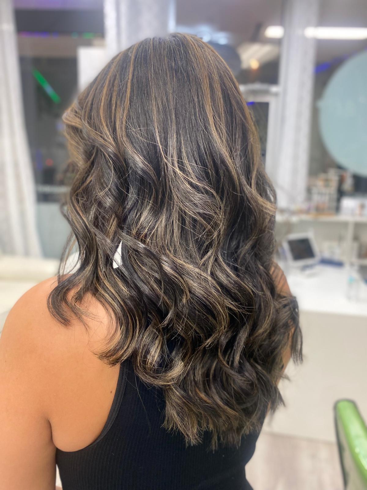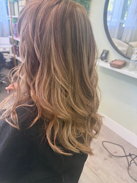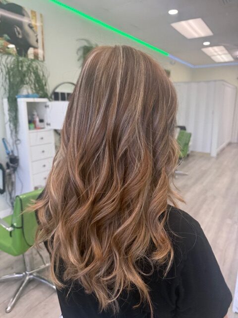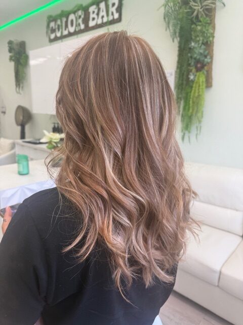 Balayage is a French word that means “to sweep.” In this hair color technique, highlights are hand-painted or “swept” on the surface of random sections of hair. Dye or lightener is usually painted on, starting midshaft and becoming denser as it moves down the section of hair to the ends. Balayage is a hair coloring technique that creates a natural, sun-kissed, and blended look, often with brighter highlights around the face and ends.