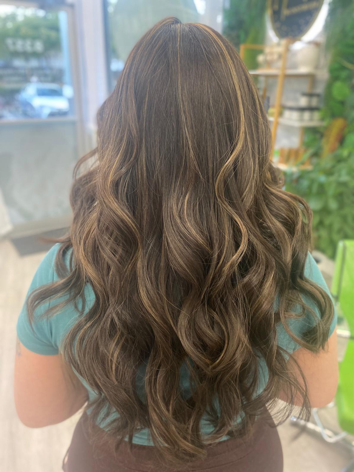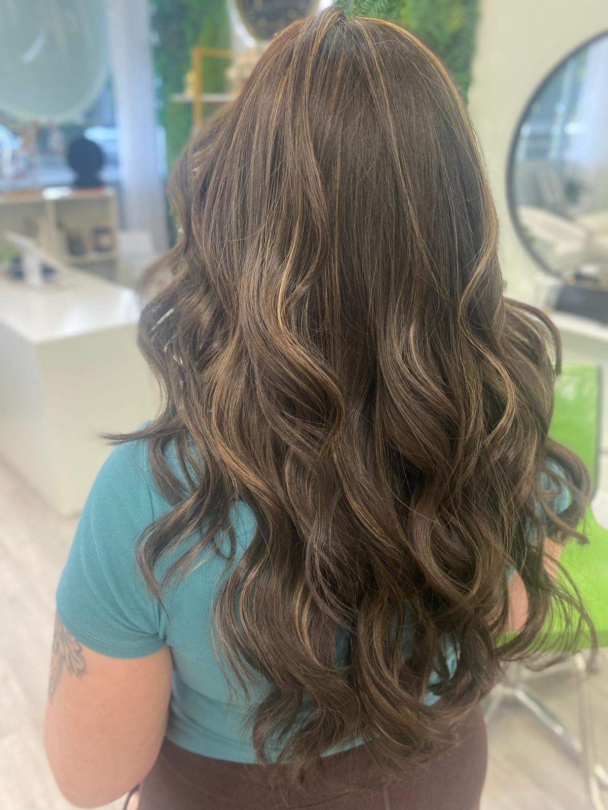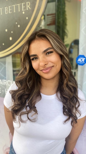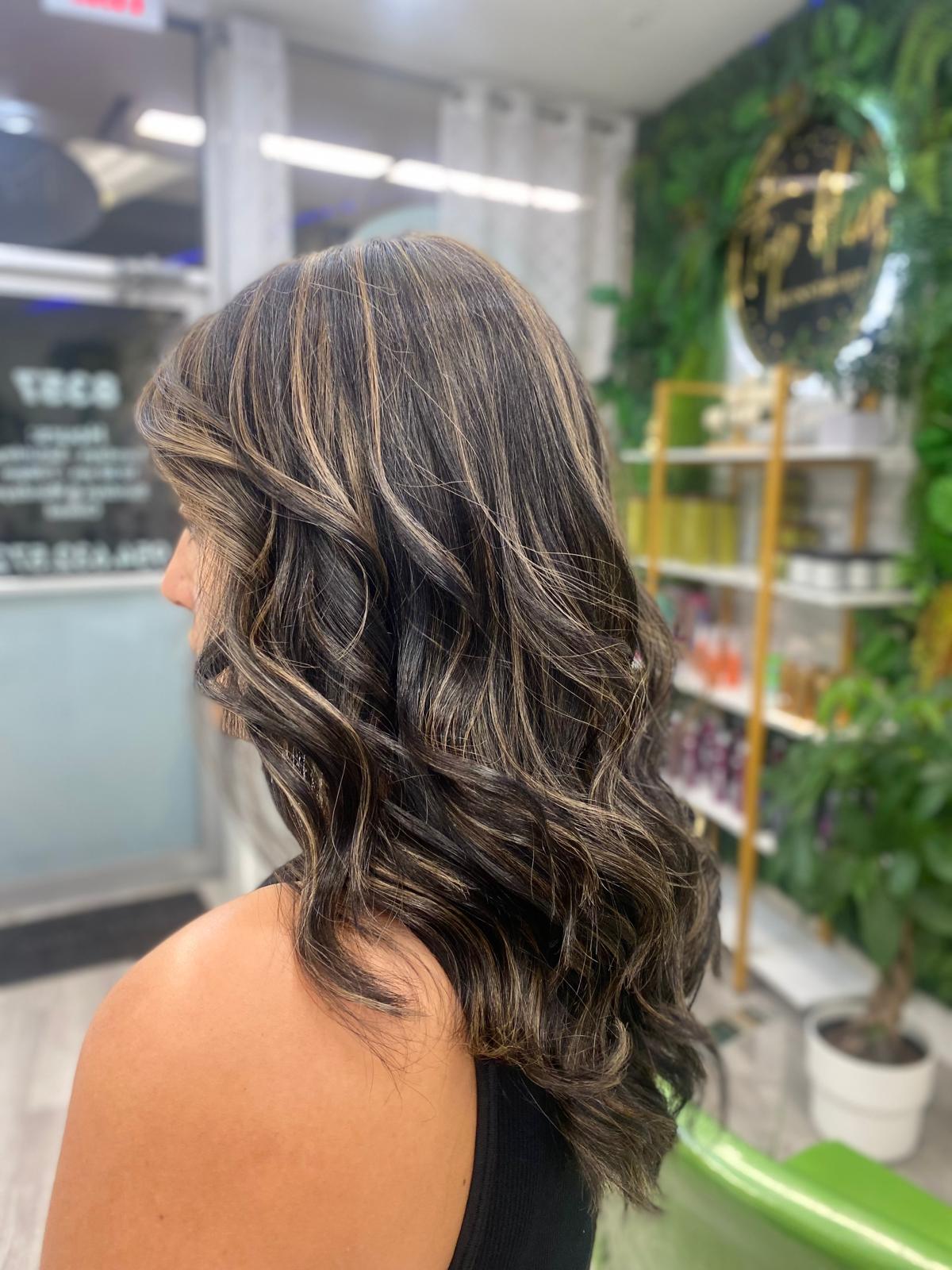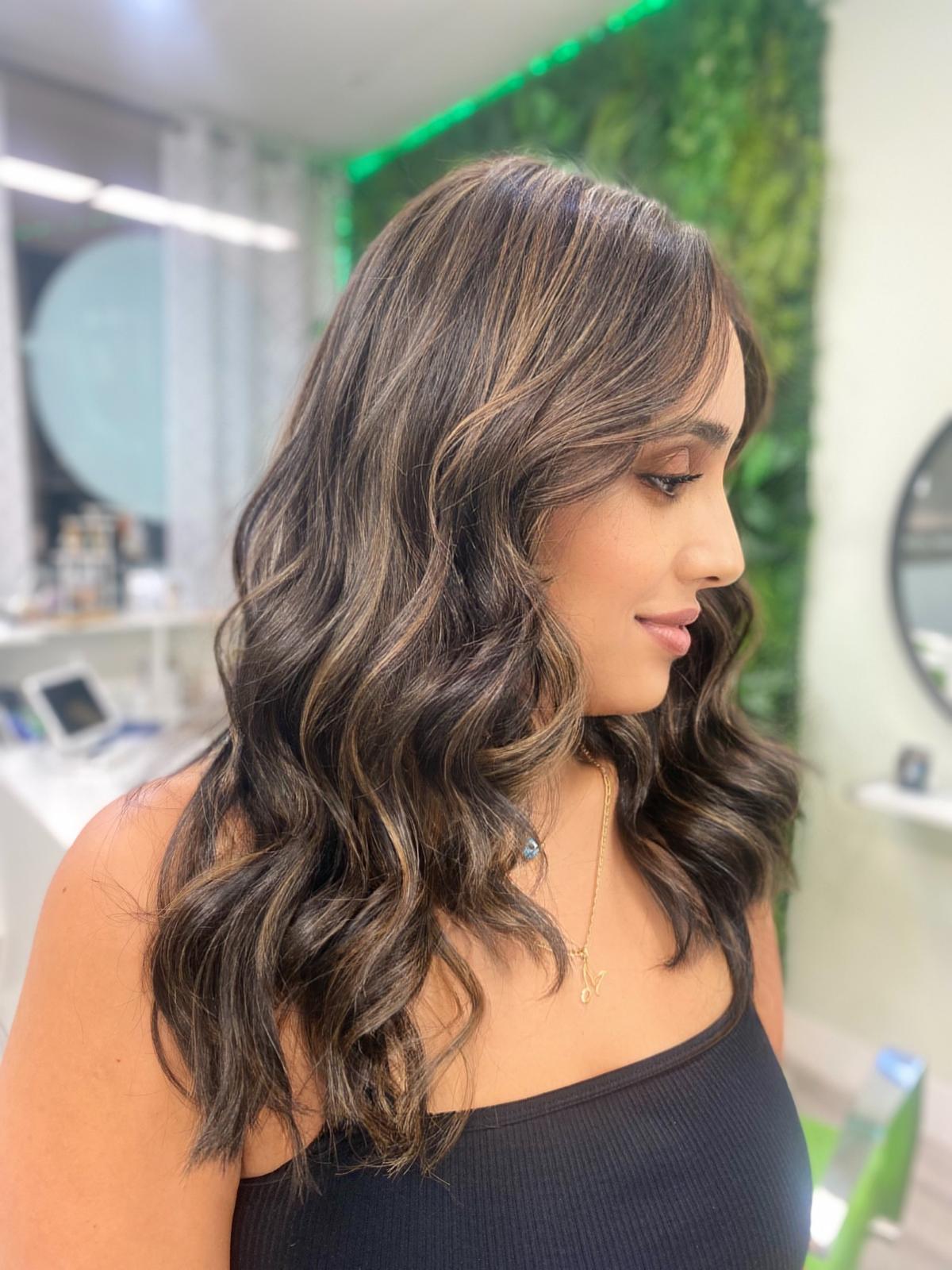 Balayage is a French word that means “to sweep.” In this hair color technique, highlights are hand-painted or “swept” on the surface of random sections of hair. Dye or lightener is usually painted on, starting midshaft and becoming denser as it moves down the section of hair to the ends. Balayage is a hair coloring technique that creates a natural, sun-kissed, and blended look, often with brighter highlights around the face and ends.