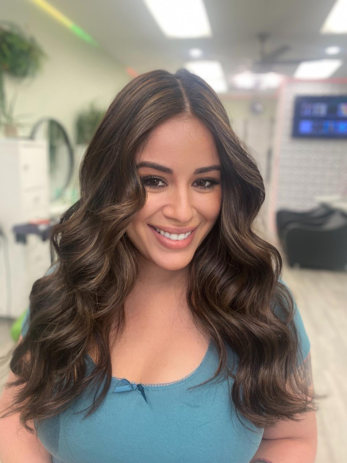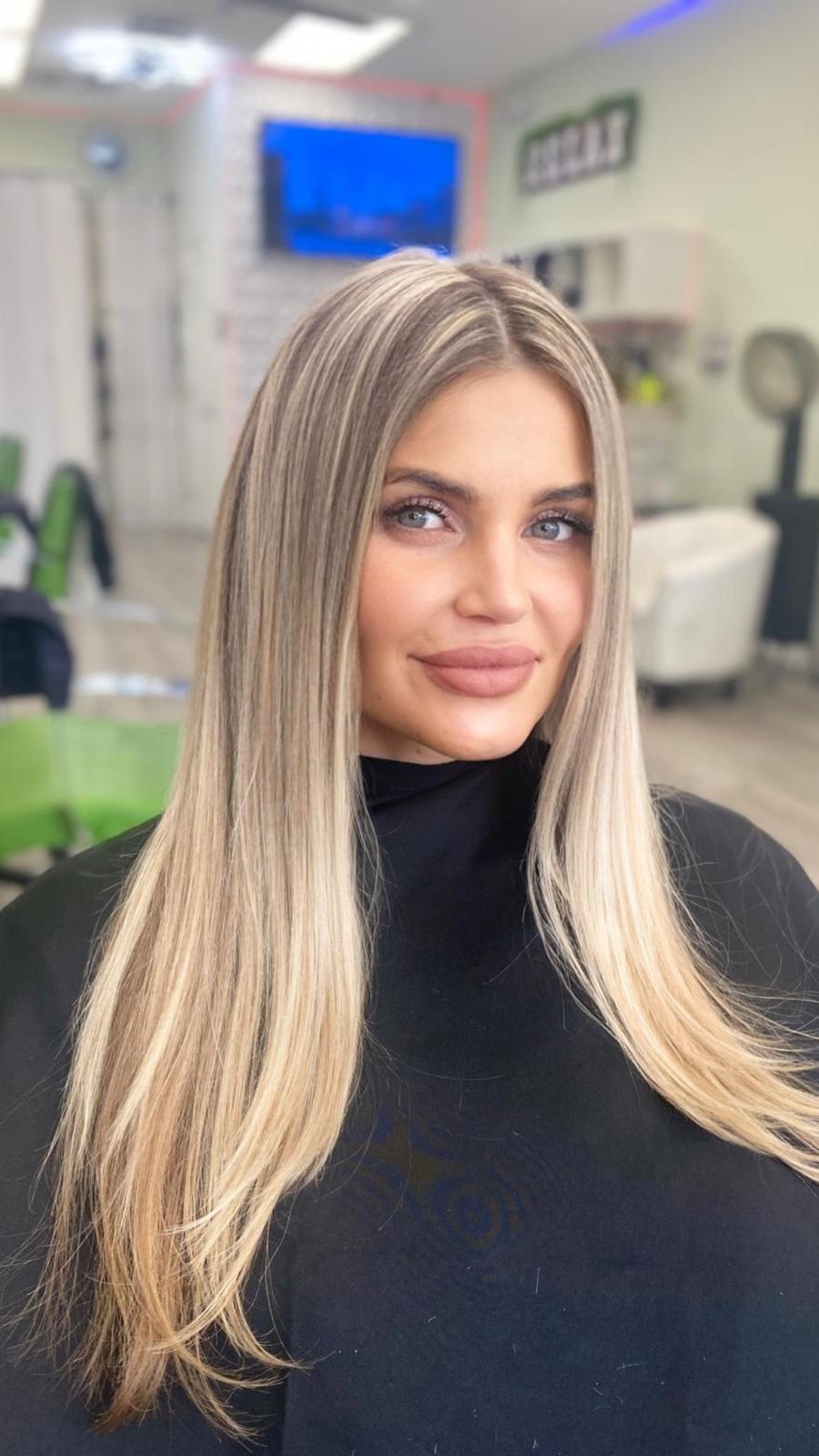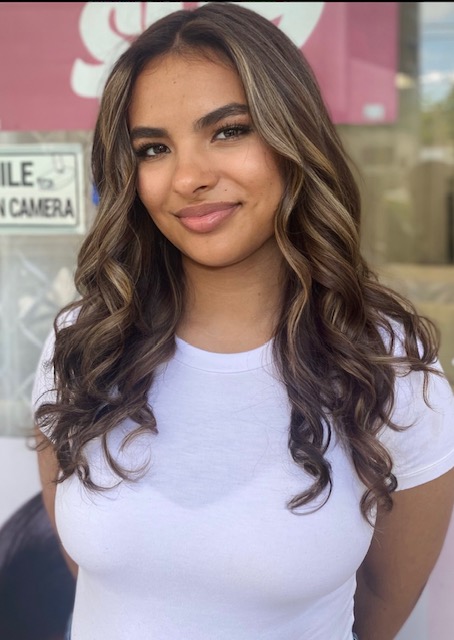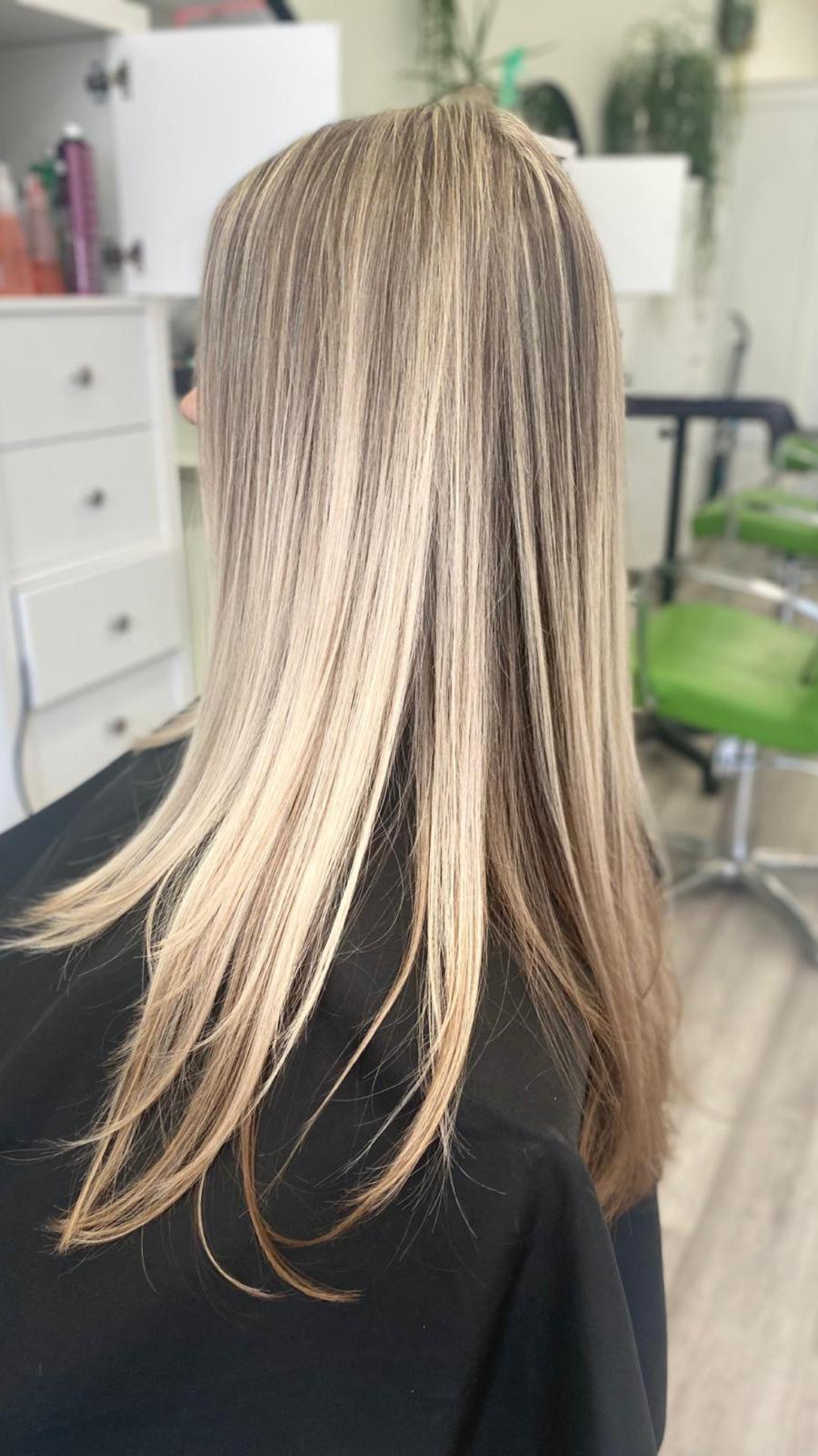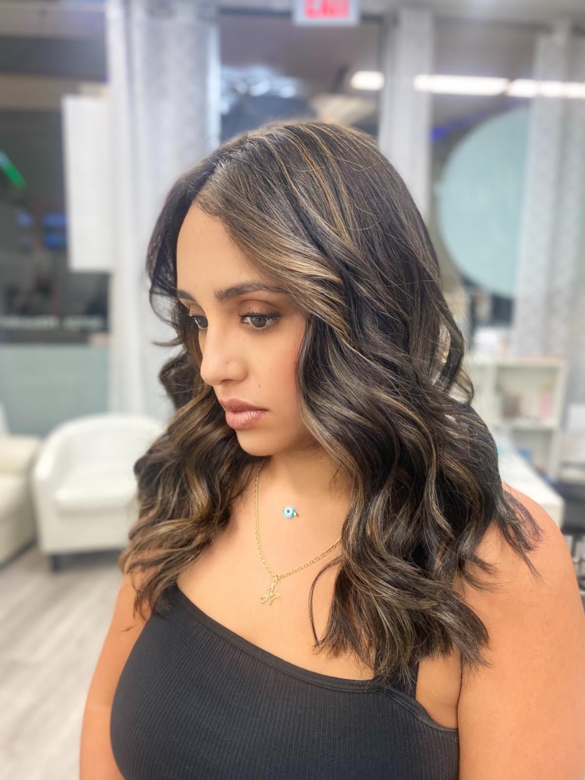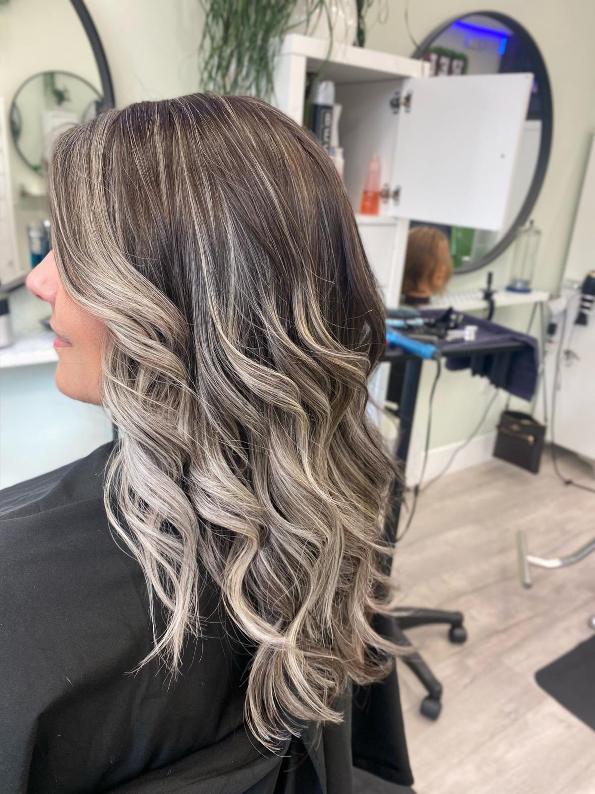 Balayage is a French word that means “to sweep.” In this hair color technique, highlights are hand-painted or “swept” on the surface of random sections of hair. Dye or lightener is usually painted on, starting midshaft and becoming denser as it moves down the section of hair to the ends. Balayage is a hair coloring technique that creates a natural, sun-kissed, and blended look, often with brighter highlights around the face and ends.