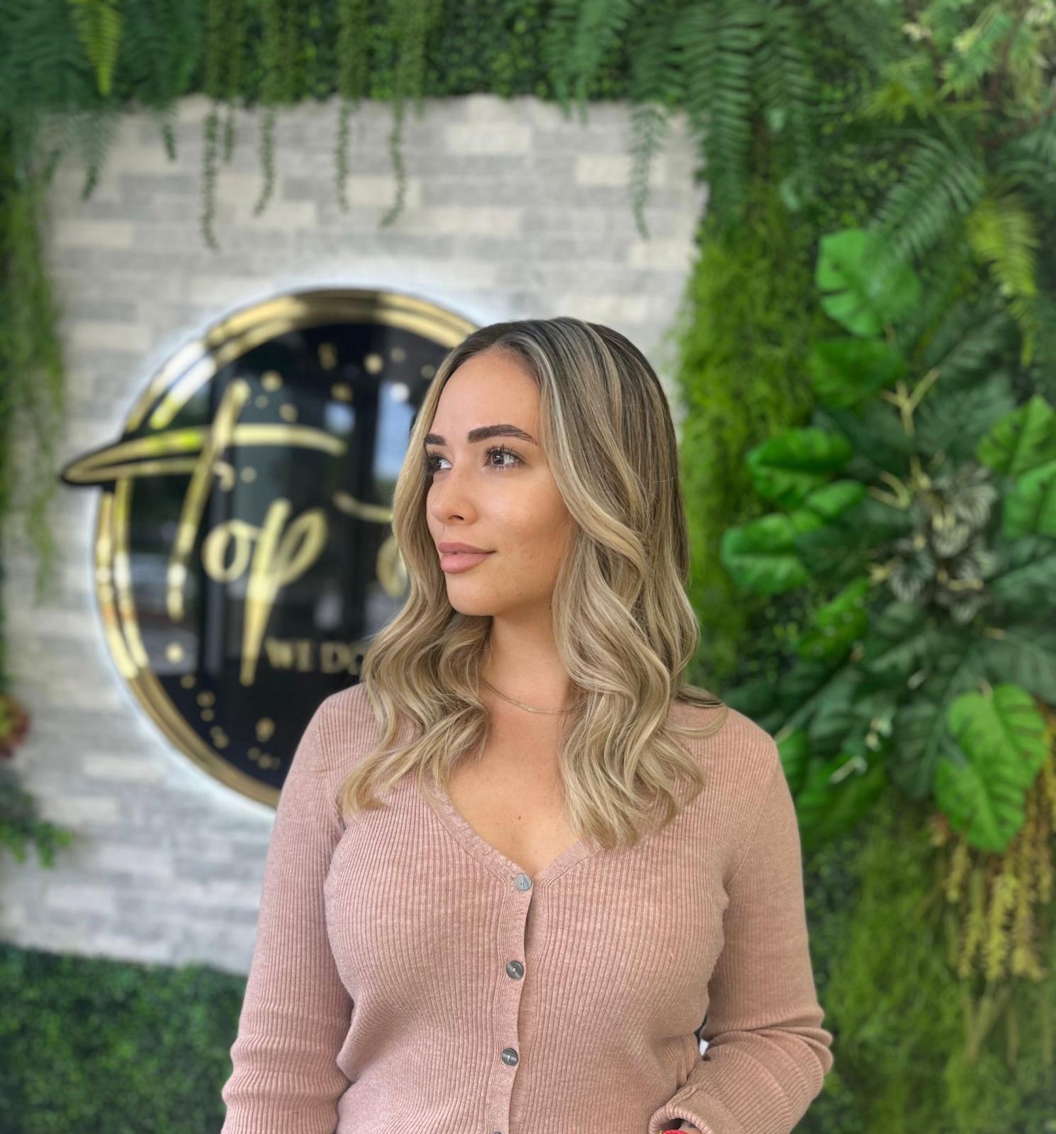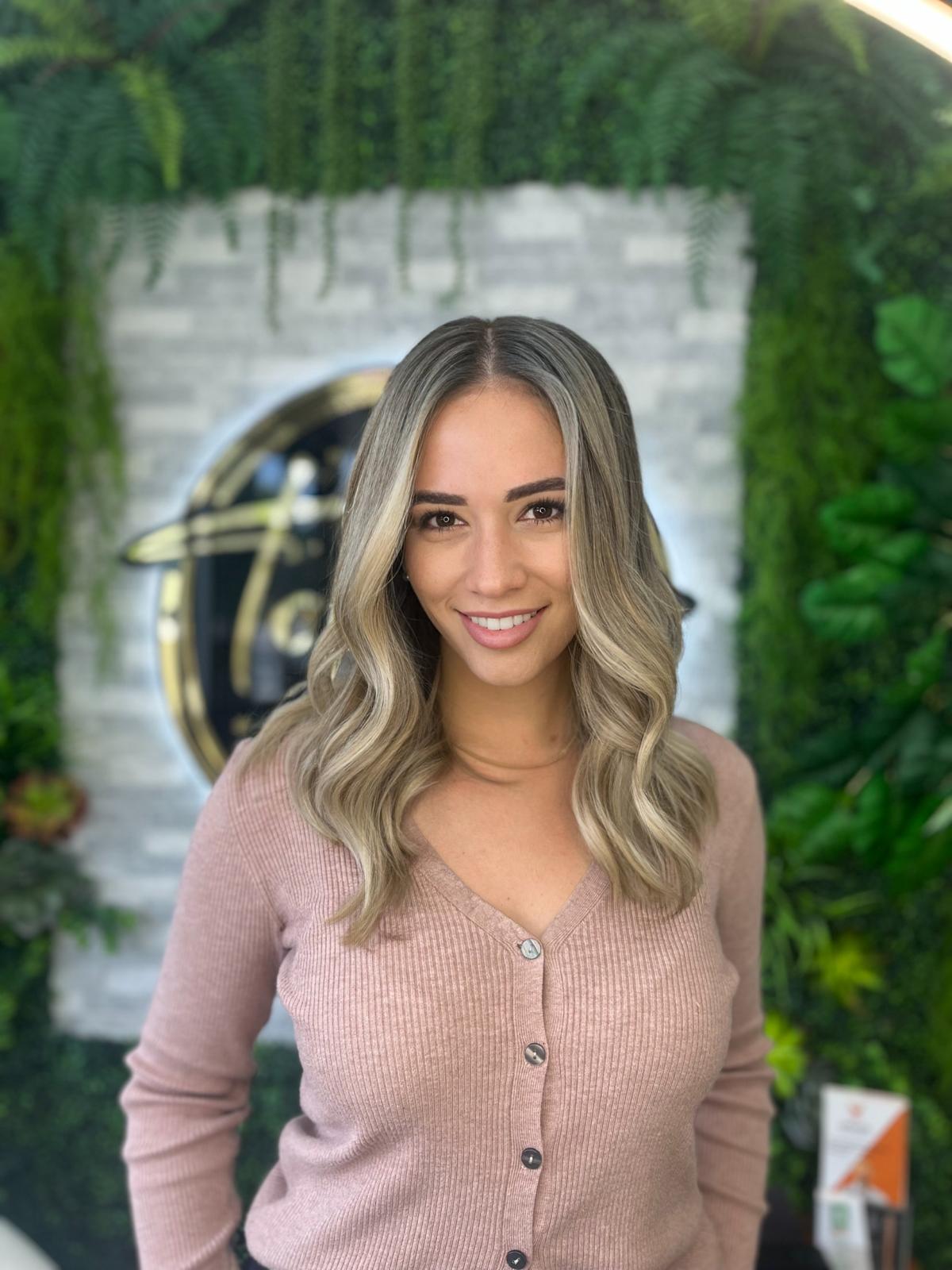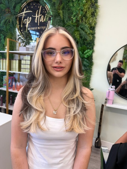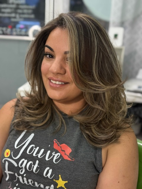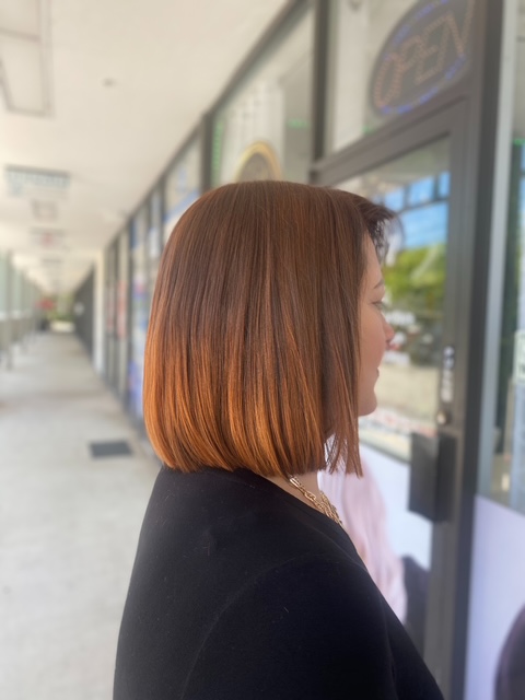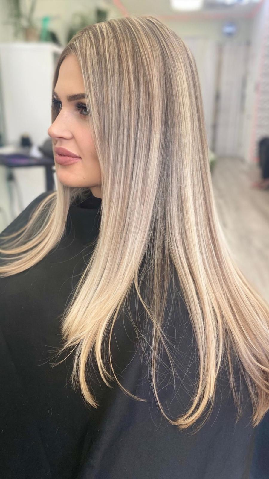 Balayage is a French word that means “to sweep.” In this hair color technique, highlights are hand-painted or “swept” on the surface of random sections of hair. Dye or lightener is usually painted on, starting midshaft and becoming denser as it moves down the section of hair to the ends. Balayage is a hair coloring technique that creates a natural, sun-kissed, and blended look, often with brighter highlights around the face and ends.